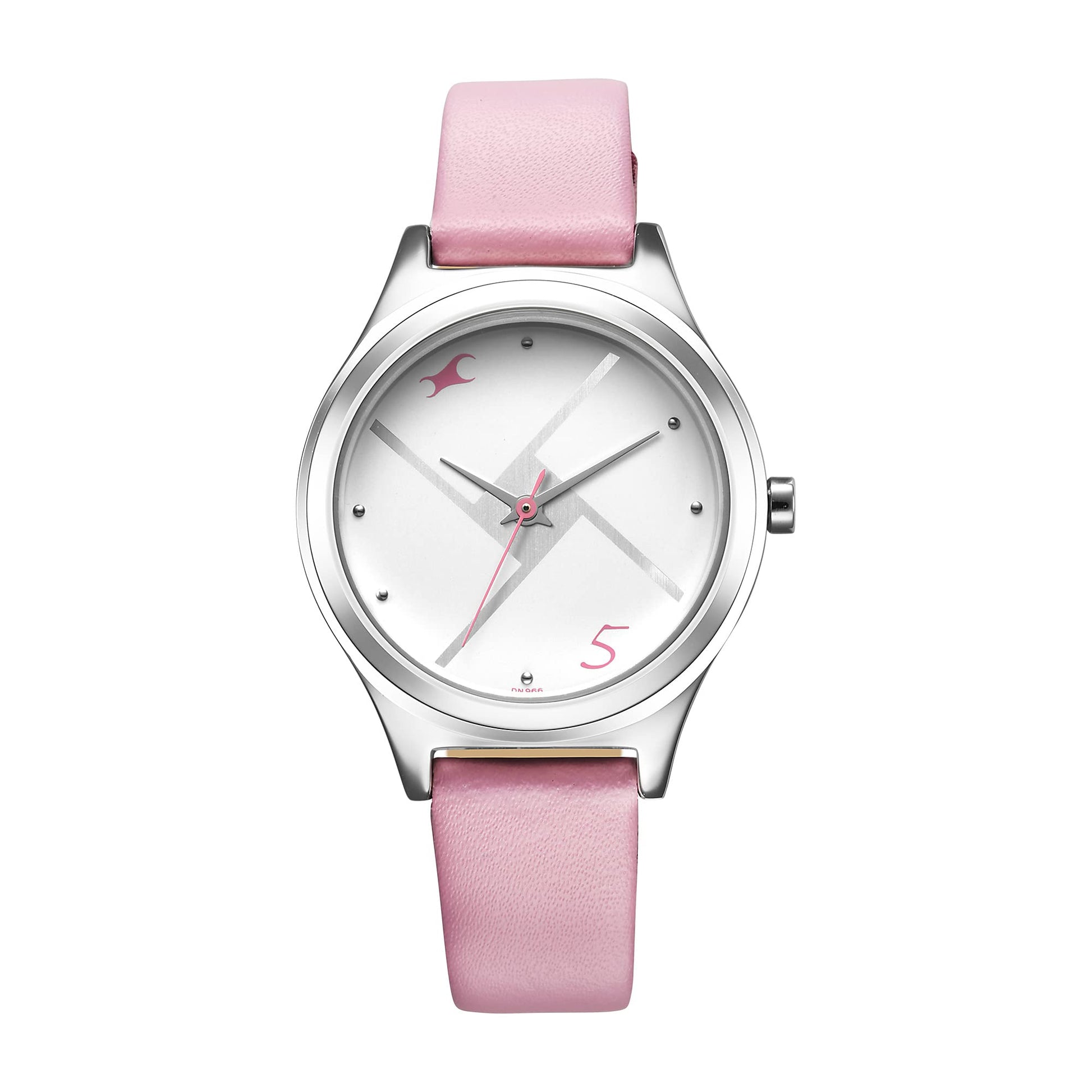 The Fabletrack Stunners watch combines a striking geometric silver dial with a bold, singular pink numeral at the 5 o’clock position, offering a distinctive yet elegant visual appeal. Its minimalist design features clean lines and subtle dot indices, enhancing readability while maintaining a refined look. The interplay of cool silver tones with a soft pink leather strap creates an appealing balance between sleek sophistication and gentle femininity. This watch effortlessly blends contemporary style with a playful touch, making it an ideal accessory for girls seeking both charm and understated elegance in their timepiece.