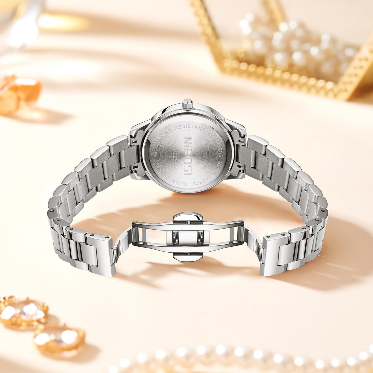 Nivaro Watches for Women combines luxury and functionality with a stunning rose gold diamond-encrusted case and an elegant green dial featuring diamond and pearl hour markers. Powered by a high-precision imported quartz movement and protected by scratch-resistant mineral glass, this timepiece ensures durability and reliable timekeeping. The comfortable stainless steel rose gold band with a butterfly buckle enhances both style and fit. Suitable for diverse occasions—from parties and work to travel and light sports—its 3ATM water resistance protects against rain and splashes. Packaged elegantly, it makes a perfect gift, backed by a 12-month warranty and responsive customer support.